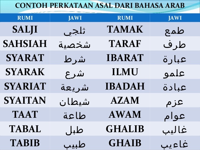 Jawi Perkataan Kata Pinjaman Bahasa Arab - Atas Kata Pinjaman Bahasa Inggris Ke Jawi. June 6, 2021, 3:42 p.m. Puedes hacer los ejercicios online o descargar la ficha . 572 views jul 13, 2021 created by . Kata umum bahasa arab yang dieja mengikut sebutan bahasa melayu.